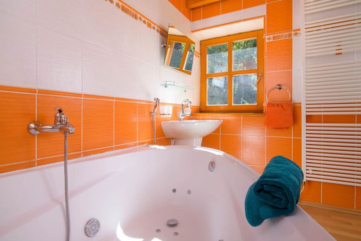 Pokoj Královka má manželskou postel v přízemí, v podkroví další 4 samostatná lůžka, vanu pro 2 osoby a WC.