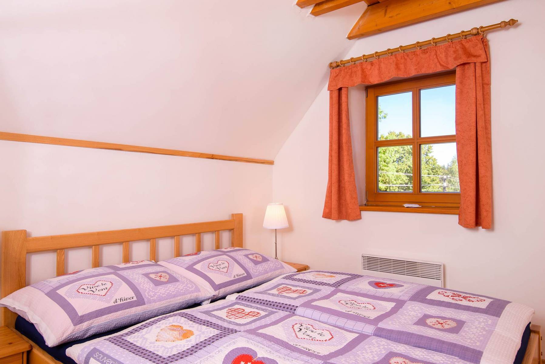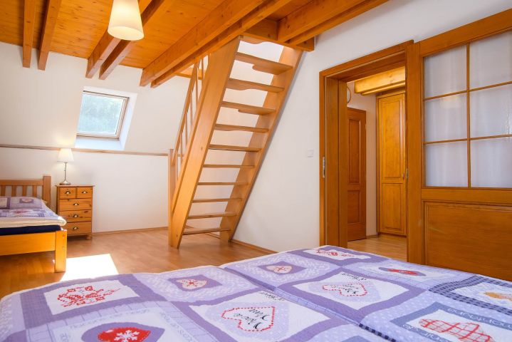 Pokoj Slovanka má manželskou postel v přízemí, v podkroví další 2 samostatná lůžka, sprchový kout a WC.